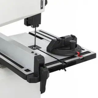 JWBS-9S (арт.10000285M) – настольный ленточнопильный станок для частного любительского применения. Позволяет распускать заготовки толщиной до 90 мм и шириной до 225 мм. Укомплектован трехроликовыми направляющими с шарикоподшипниками, обеспечивающими легкое движение ленты, минимальный износ и простоту регулировки. Ведущий шкив приводится во вращение через зубчато-ременную передачу, а не установлен непосредственно на валу двигателя, как часто делают для упрощения конструкции. Такая разнесенная схема дает более плавное без биений вращение и лучшую ремонтопригодность.